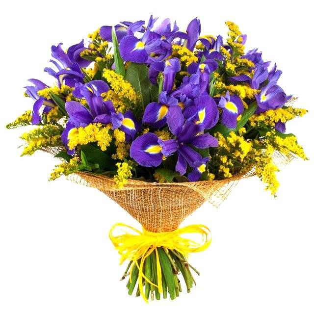 Необычное сочетание цветов в этом букете делает его очень оригинальным и уникальным. Насыщенно-фиолетовые ирисы, олицетворяющие на языке цветов отвагу и мужество, в сочетании с ярко-желтыми солидаго, создают невероятную контрастную композицию, а дополнительное украшение из зелени салала делает ее еще более насыщенной. Этот поистине джентельментский букет станет универсальным подарком на любой праздник или просто в обыденный день, а также поможет получателю забыть все обиды.