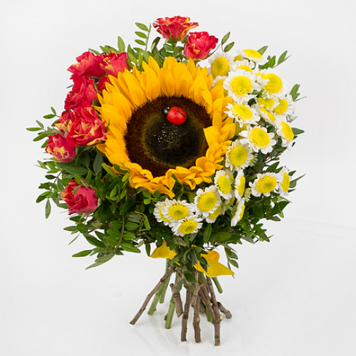 Гармоничный осенний букет, дарящий тепло и радость. В центре композиции находится подсолнух, который, как известно, является символом небесного светила, символизирует силу, радость и жизненную энергию. Окруженный яркими кустовыми розами и хризантемами, подсолнух как бы излучает еще больше тепла и света, передавая огромную радость и восхищение от встречи.